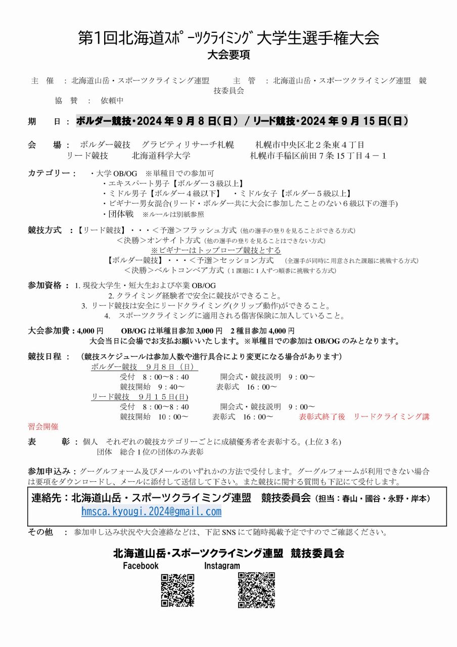 申込み用グーグルフォーム https://forms.gle/Z5ADVQyynFrQWEj47 連絡先:北海道山岳・スポーツクライミング連盟 競技委員会(担当:春山・國谷・永野・岸本) hmsca.kyougi.2024@gmail.com ワード文書へ