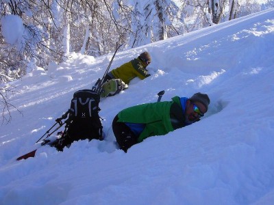 2日目は、神居山の裏斜面を使い、パウダー滑走、弱層テスト、ビバーク訓練などを行いました。