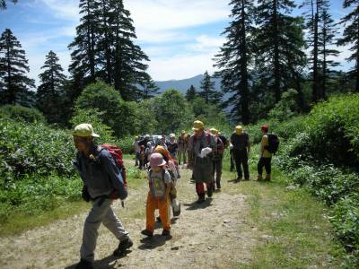 7/26 開校式 講義 七夕飾りつくり クライミング体験 七夕飾りつけ と すいか割り 道路向のフラワーガーデン(笹盛さん所有)見学 炊事係りのお世話に感謝し夕食 花火大会 7/27 ラジオ体操、朝食後登山出発 熊の糞のかんさつ 為野リーダーから話を聞いて登山開始 閉校式 閉校式後ジュニア委員会の今後の体制など話し合いました