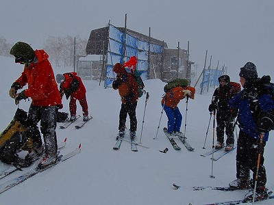 チセ班8名は強風無視界のなか、なんとか900m附近まで達したが、斜面状態がアイスバーン